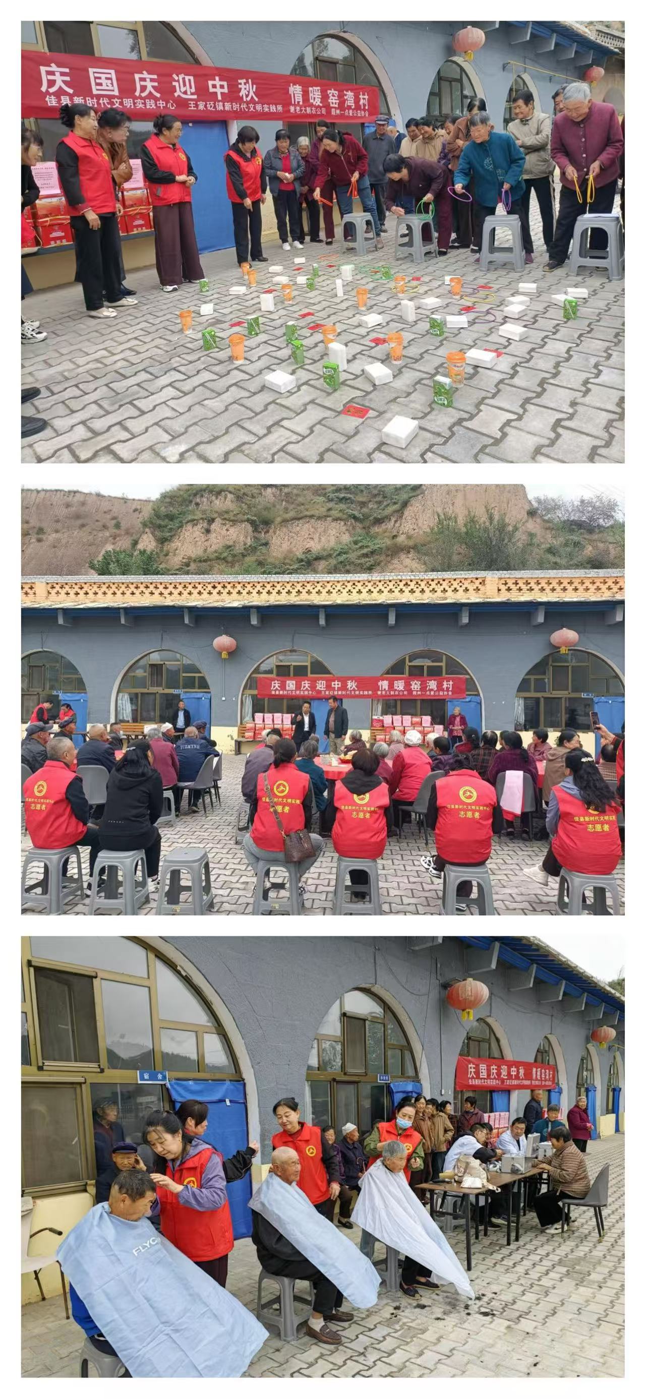 活动中,新时代文明实践志愿者为老人们进行了健康义诊、爱心理发。测血糖、量血压、精心剪出老人们满意的发型,现场忙的不亦乐乎。活动还为大家准备了月饼、水果、佳县特产芝麻饼,老人们一边吃一边高兴地说现在的社会真是好。文艺演出互动环节,移风易俗小品《高价彩礼要不得》赢得阵阵掌声,自告奋勇的爷爷奶奶演唱《东方红》《万丈高楼平地起》《信天游》等时代记忆歌曲让大家沉浸在时光的记忆中。游戏环节,套圈、接力乒乓球等将活动气氛推向了高潮。活动还为每个老人发放了节日礼品,大家纷纷表示新时代党的政策好,让他们切实感受到了节日的温暖。