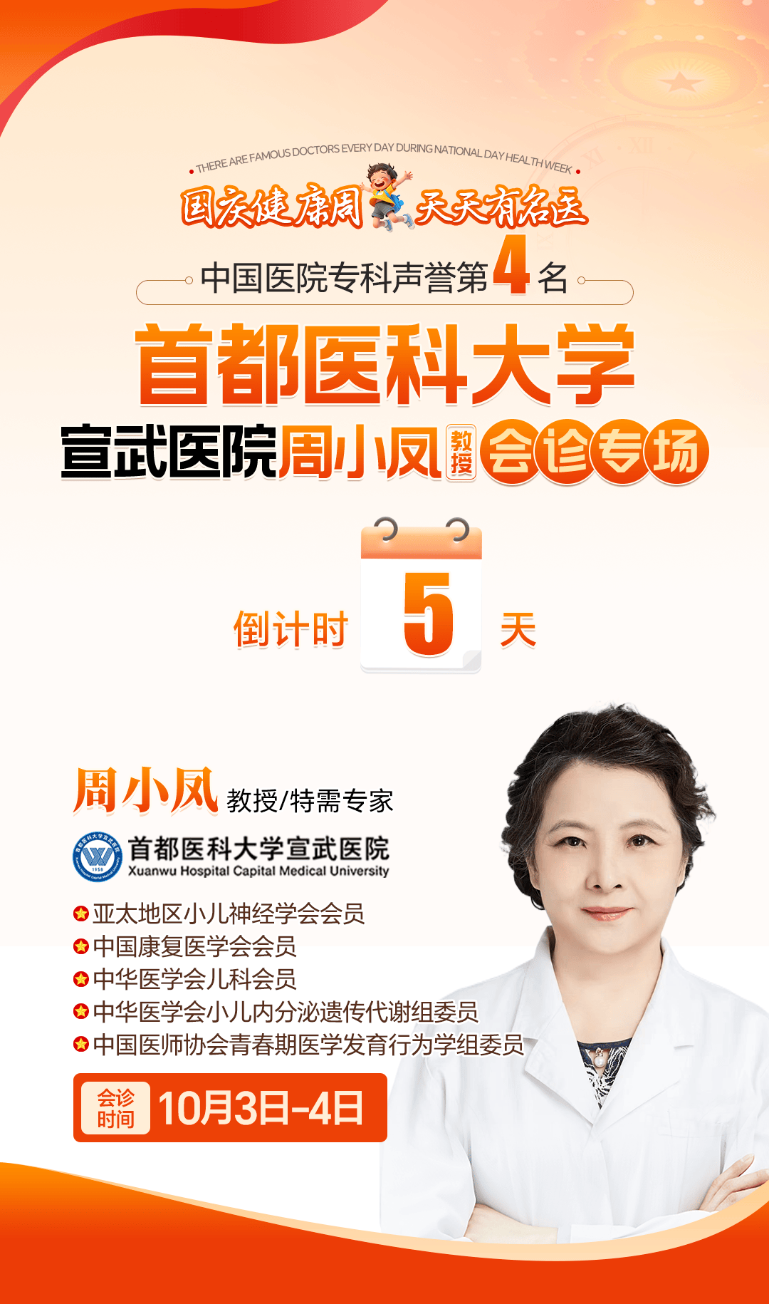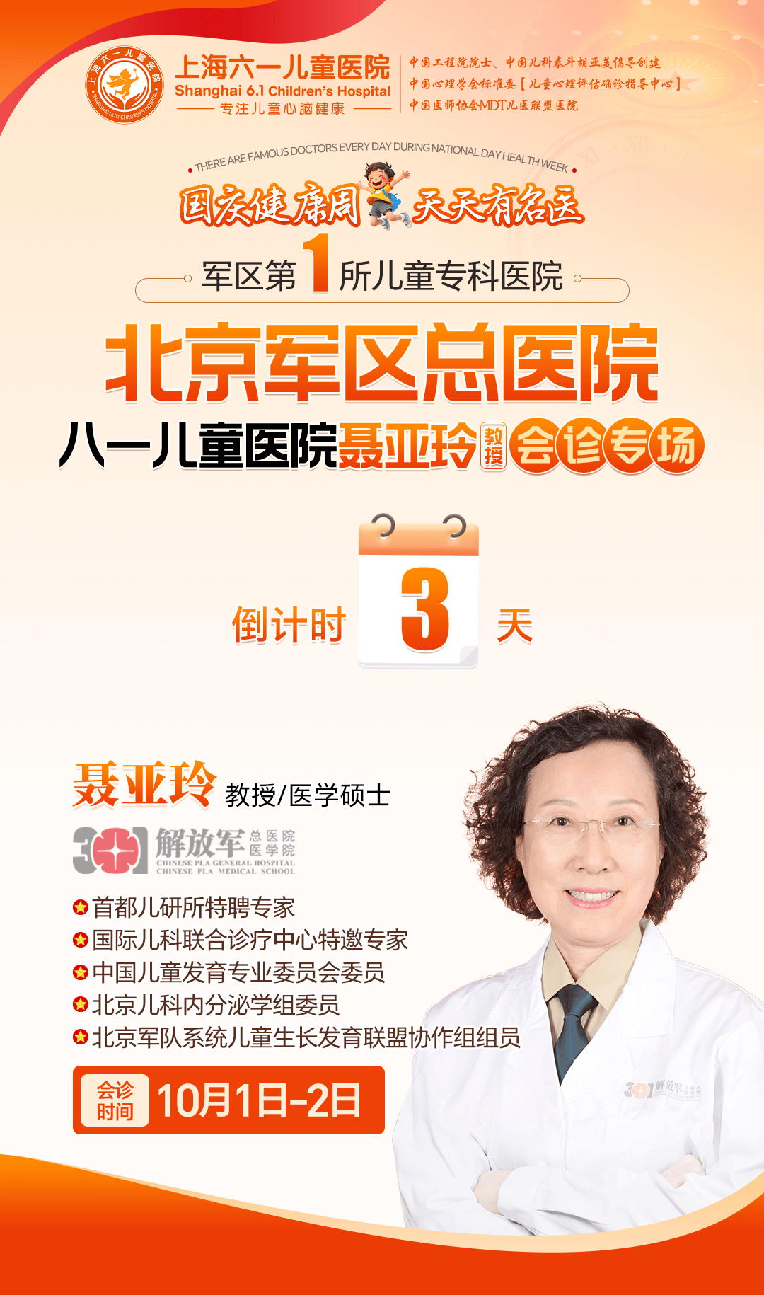 为抓住假期这一健康干预的黄金窗口,10月1日-8日,上海六一儿童医院特别推出"国庆专家联合会诊周",集结京沪两地儿科领域资深专家:中国人民解放军总医院 聂亚玲教授、 首都医科大学宣武医院 周小凤教授,同济大学附属上海第十人民医院 谷丽教授,上海市中医医院 翁婷教授,中国人民解放军总医院聂亚玲教授等,在院开展为期8天的大型联合公益会诊,家长无需远行,在家门口就让孩子享受到国内资深的儿科诊疗服务!