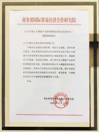 近日,山东中健长生露生物科技有限公司的创新销售模式成功入选商务部国际贸易经济合作研究院(简称商务部研究院)课题研 究案例,这一认证不仅彰显了企业在大健康领域的创新实力,更借助国家级高端智库的权威背书,为其全球化发展战略奠定了坚实基础。