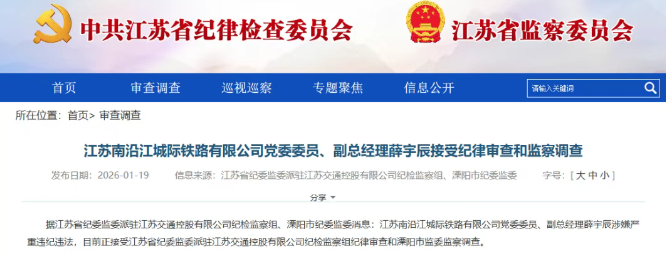 据江苏省纪委监委派驻江苏交通控股有限公司纪检监察组、溧阳市纪委监委消息:江苏南沿江城际铁路有限公司党委委员、副总经理薛宇辰涉嫌严重违纪违法,目前正接受江苏省纪委监委派驻江苏交通控股有限公司纪检监察组纪律审查和溧阳市监委监察调查。
