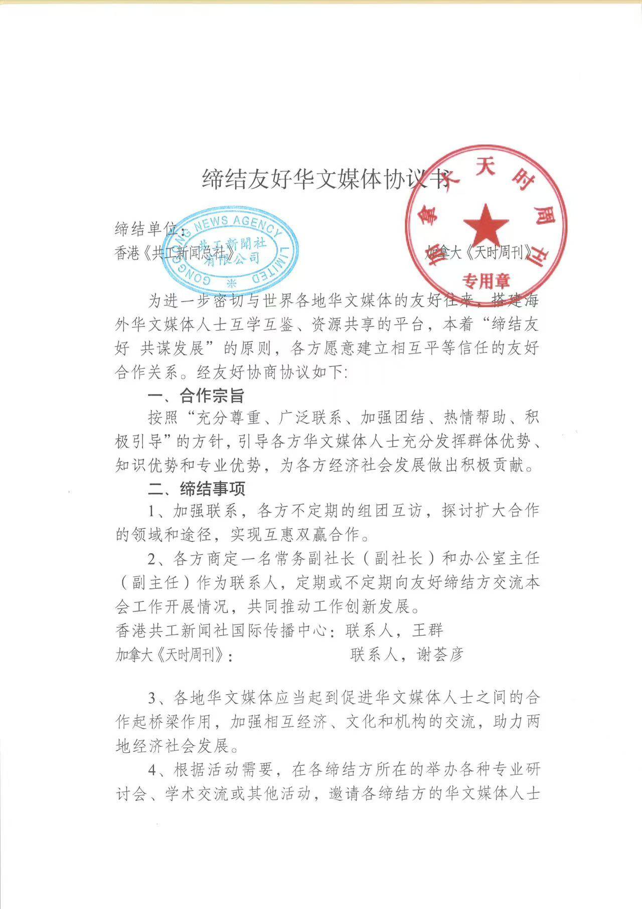 香港共工新闻社与加拿大《天时周刊》战略合作协议书截图。
