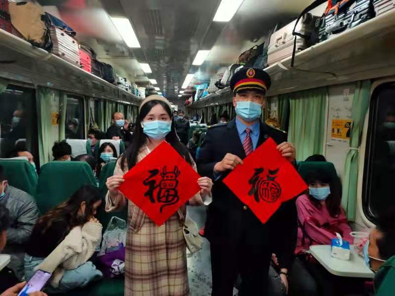 “金牛贺岁、玉鼠回宫、小年已至、佳节不远,小年与旅客们在列车上有缘相聚,我们列车工作人员书写了一些牛年的福字,祝大家在新的一年里,牛气冲天、福牛相伴!”K9060次列车长刘广的开场语立马吸引了车厢旅客的目光。