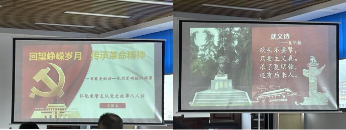 在4月20日的首期开讲中,主讲人为该支队二大队有着35年党龄、32年警龄的民警肖国安,他讲述的党史故事是《一首最美的诗——先烈夏明翰的故事》。“党史故事人人讲,怀铁乘警心向党”。故事开讲时,肖国安用这句话作为他的开讲开场白。紧接着,肖国安又用夏明翰的那首著名的就义诗“砍头不要紧,只要主义真,杀了夏明翰,还有后来人”正式开讲。他深情地说,这是一首震撼人心、流传千古的就义诗,更是一首豪情壮志、气壮山河的经典之歌。