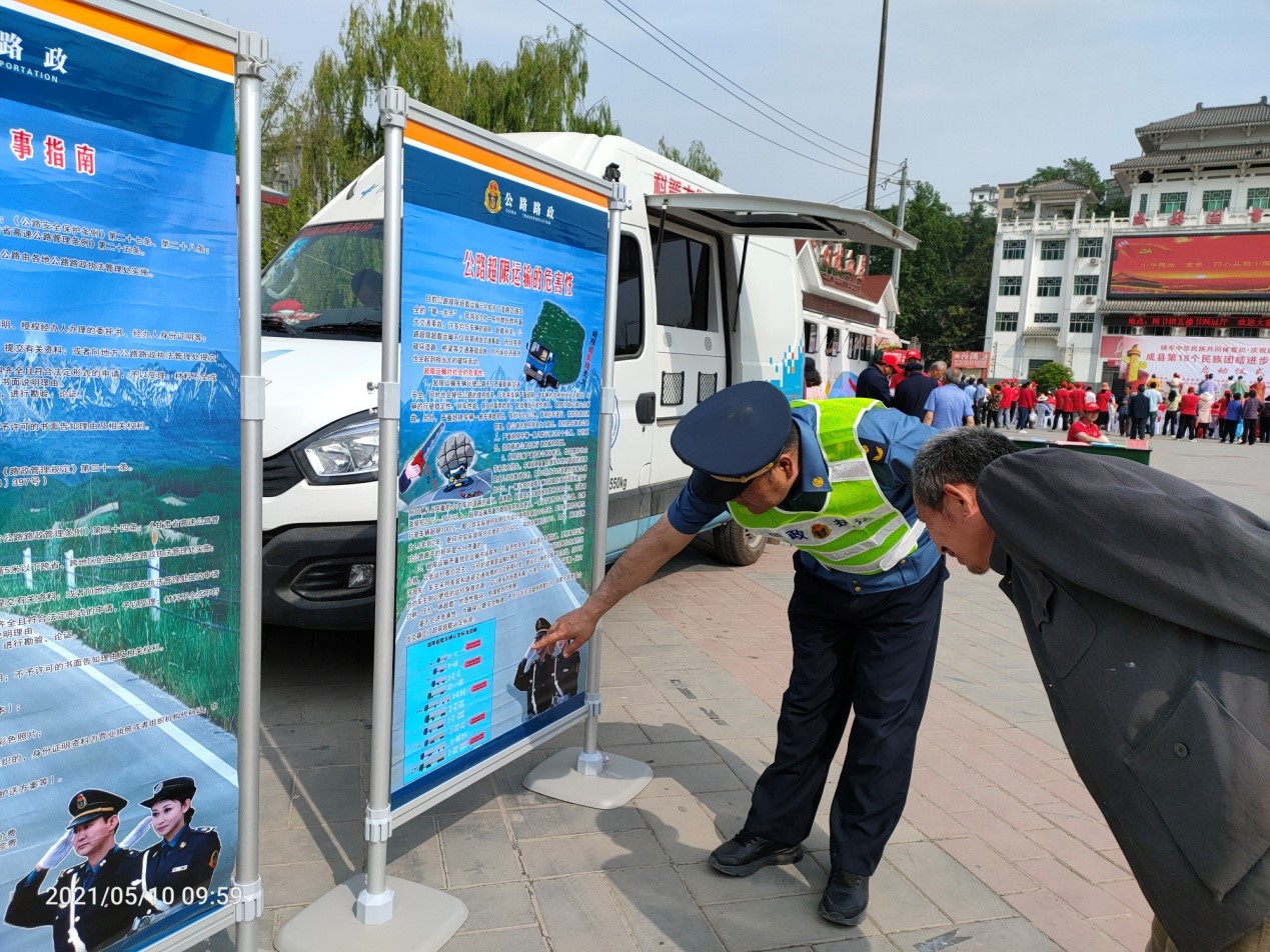 (执法人员在文化广场设置展板并向群众宣传公路法律法规)