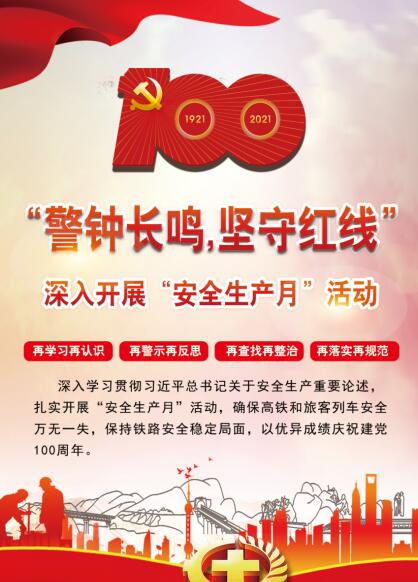 为深入学习贯彻习近平总书记关于安全生产重要论述和对铁路安全工作的重要指示批示精神,统筹安全发展,中国铁路南昌局集团 有限公司鹰潭工务段以“警钟长鸣,坚守红线”为主题,以“再学习再认识,再警示再反思,再查找再整治,再落实再规范”为主要内容,在全段开展“安全生产月”活动,确保高铁和旅客列车安全万无一失,保持段运输安全稳定局面,以优异成绩庆祝建党100周年。