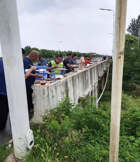 抢险中,有些工人的手被钢丝扎破了,鲜血流了出来,他们用创可贴简单地包扎,仍继续战斗;焊接工人汗水湿透了衣服,挂满了脸颊,顾不上擦洗,电光刺伤了眼睛,顾不上按揉;十二中队执法人员董存洲烈日下在车流分界点处看守疏导、指挥东西,身体中暑,头重脚轻,他用凉毛巾敷下脸仍像雕塑一般屹立在马路中间,那醒目的防护服提醒着过往车辆注意安全。工作中,热浪袭人,汗水雨水淌在脸上、流在身上,但上至领导、下至工人,没有一句怨言,没有一个退缩,始终咬牙坚持。他们头顶烈日,阵地为家,桥台为餐桌,却积极乐观,充满激情。