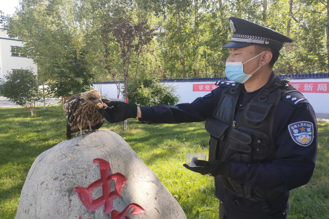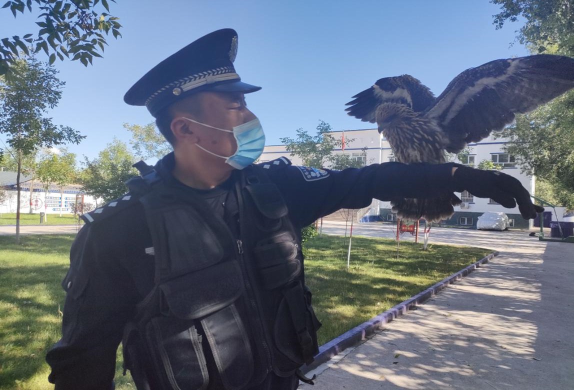 7月24日,新疆伊犁边境管理支队吐古青布拉克边境派出所民警在巡逻过程中,发现辖区灯塔学校对面知青林有一只疑似老鹰的动物躺在草坪里动弹不得,它的腿部轻微受伤,走路一瘸一拐。民警立即将其带回派出所进行悉心照顾,对其进行消毒、包扎和喂食。