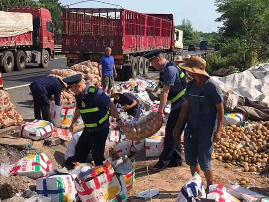 长沙东路产大队冒高温转移事故车辆货物减少车主损失。7月24日,G4京港澳高速长沙段K1458往南方向发生一起货车撞击护栏事故,运载30余吨土豆全部倾倒,事故车辆施救难度大,为避免沥青路面40度以上高温对土豆的损坏,长沙东路产大队队员与杨梓冲养护所所员一同快速转移货物。